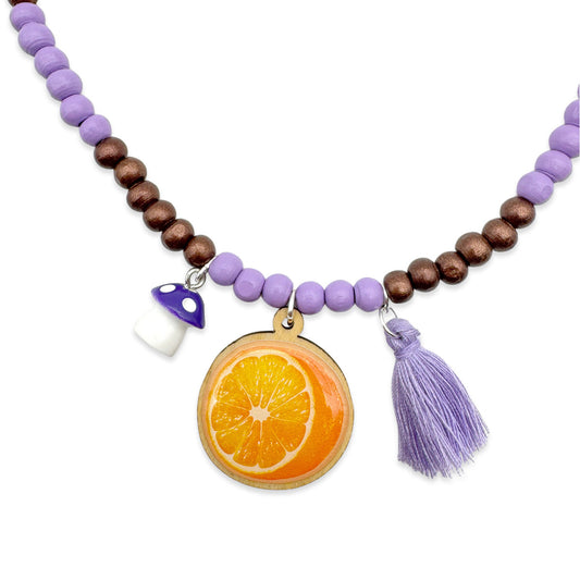 Holzkette 6mm in Orange-Cappuccino mit Pin, Quaste & Pilz