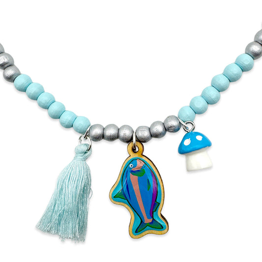 Holzkette 6mm in Hellblau-Silber mit Pin, Quaste & Pilz
