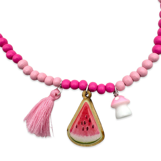 Holzkette 6mm in Lipstick-Rosa mit Pin, Quaste & Pilz
