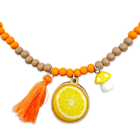Holzkette 6mm in Gelb-Gold mit Pin, Quaste & Pilz