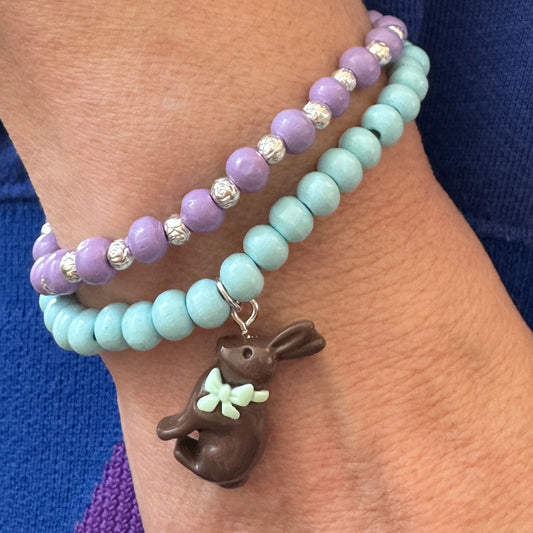 Light blue wooden bracelet with rabbit