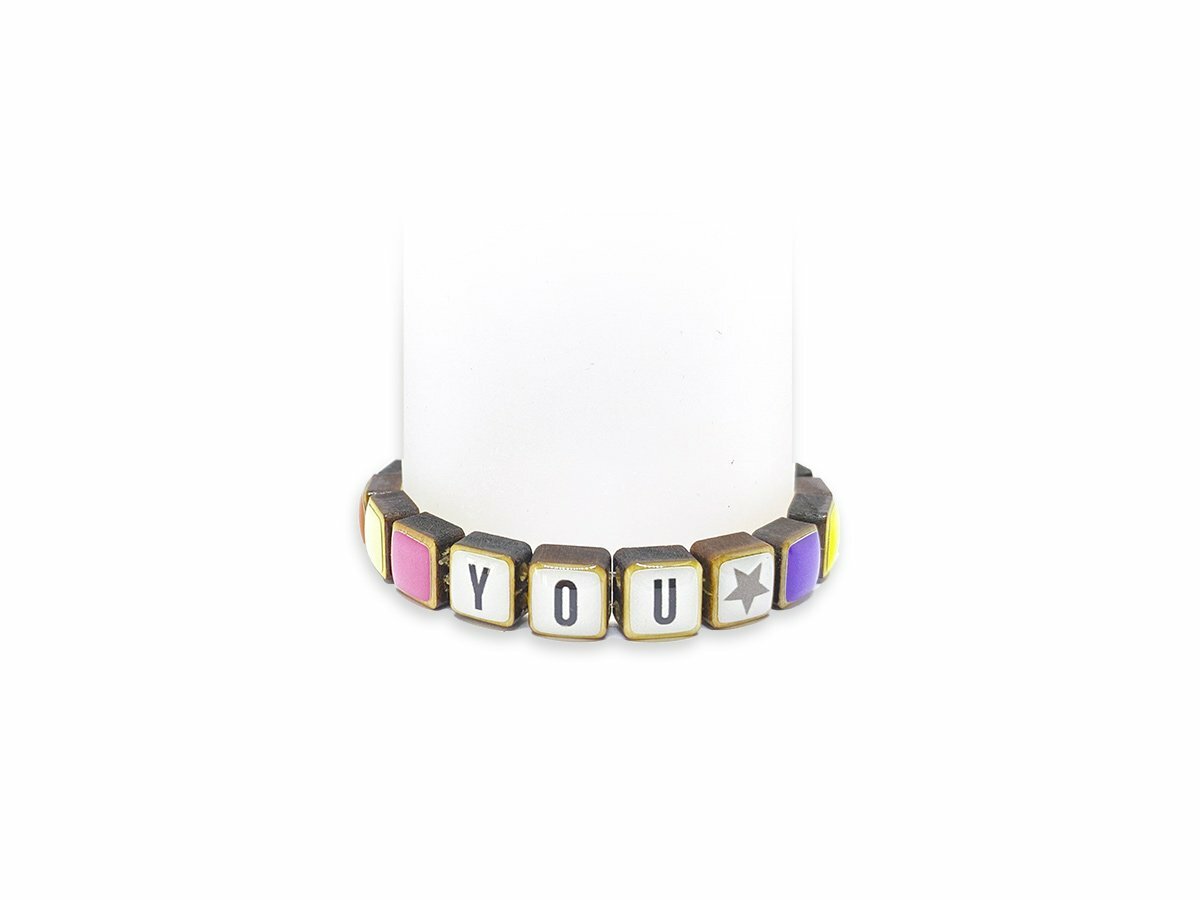 Colorful elastic Escapulario wooden bracelet with a pretty color sequence and You lettering. The 2nd picture shows the front and back of the bracelet... Can be combined nicely with other Color up bracelets...