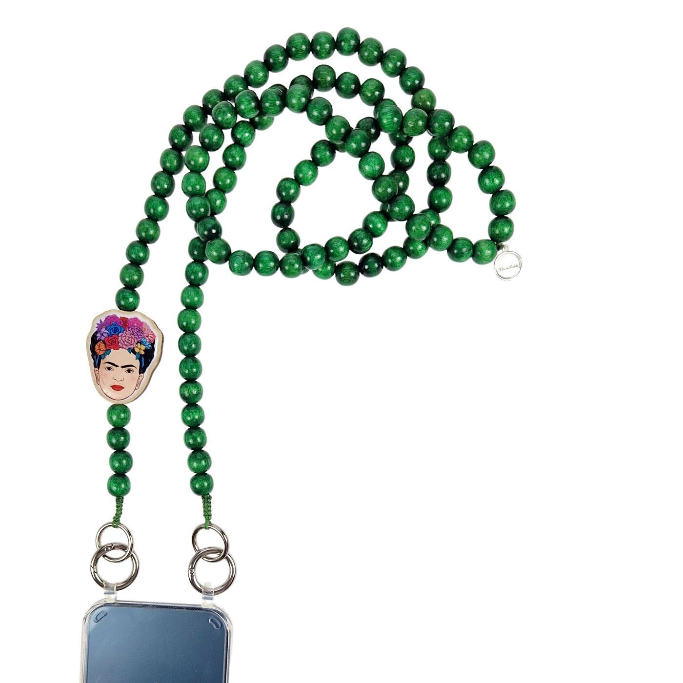 The green Frida Kahlo wooden bead cell phone chain is a unique and artistic accessory that will stylishly embellish your phone while expressing your appreciation for the famous Mexican artist Frida Kahlo. Handcrafted with attention to detail, this cell phone chain is an eye-catcher that will make you stand out from the crowd.