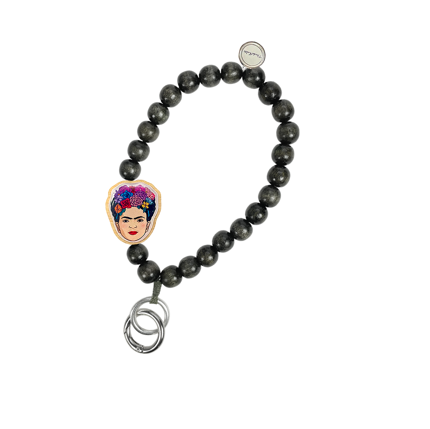 Discover our unique key chain made from high-quality 12mm wooden beads and featuring a beautiful lasered Frida Kahlo wooden pin.