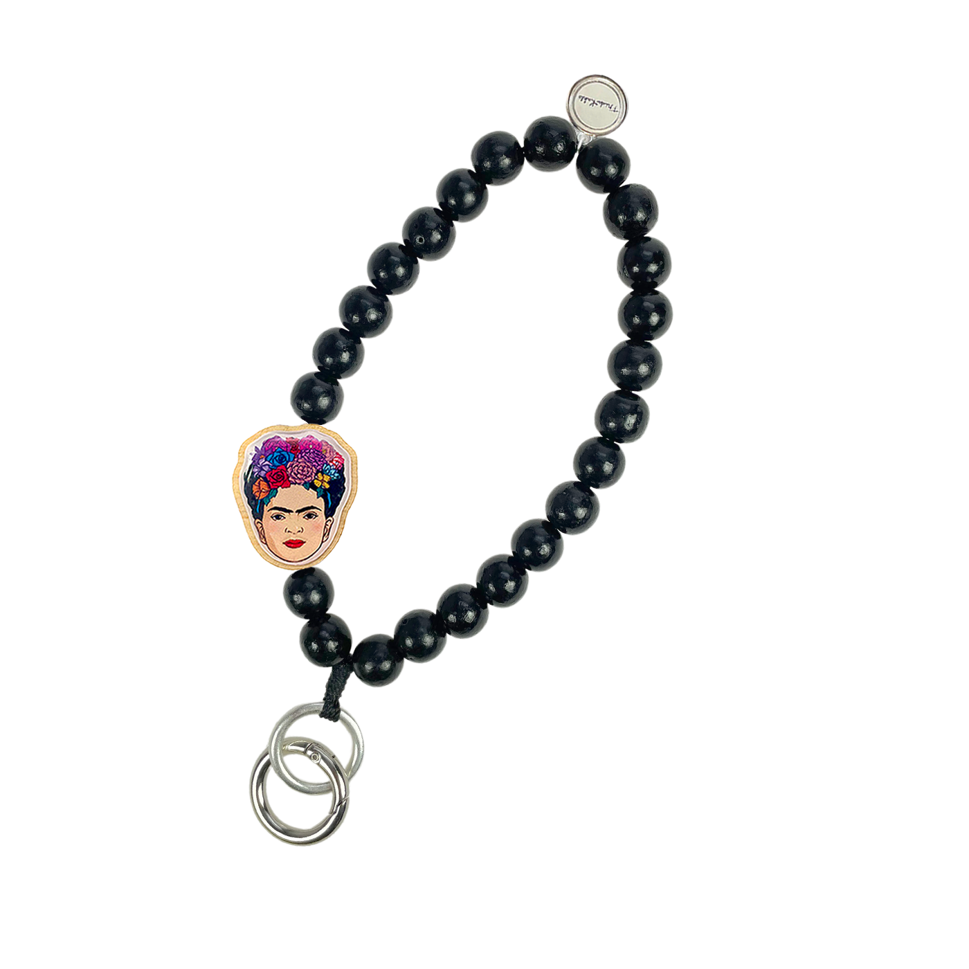 Discover our unique key chain made from high-quality 12mm wooden beads and featuring a beautiful lasered Frida Kahlo wooden pin.