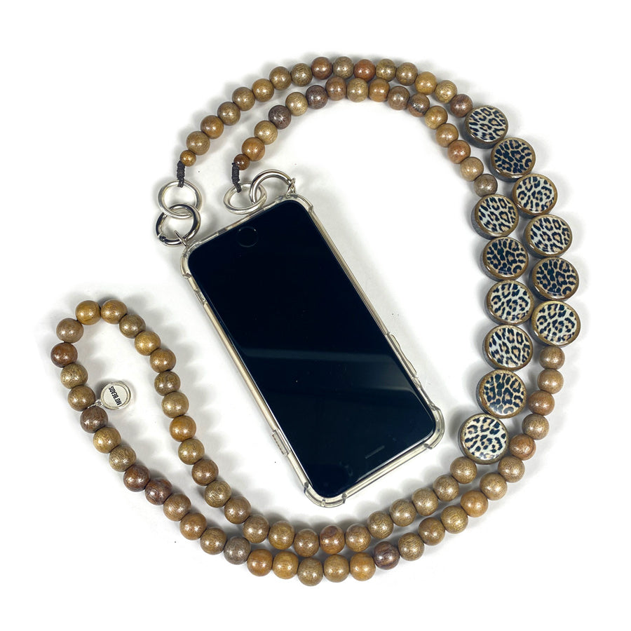 The Mobeads mobile phone chain with brown 12mm wooden beads and 12 leopard print discs is 130 cm long and is hand-knotted. It is strung on a high-quality waxed cotton thread and can be easily swapped with your existing mobile phone chain cover using two pocket rings with a click fastener. The mobile phone chain with leopard print is very special because it has been extended on each side with 6 round printed wooden discs with leopard print. A really great fashionable accessory.