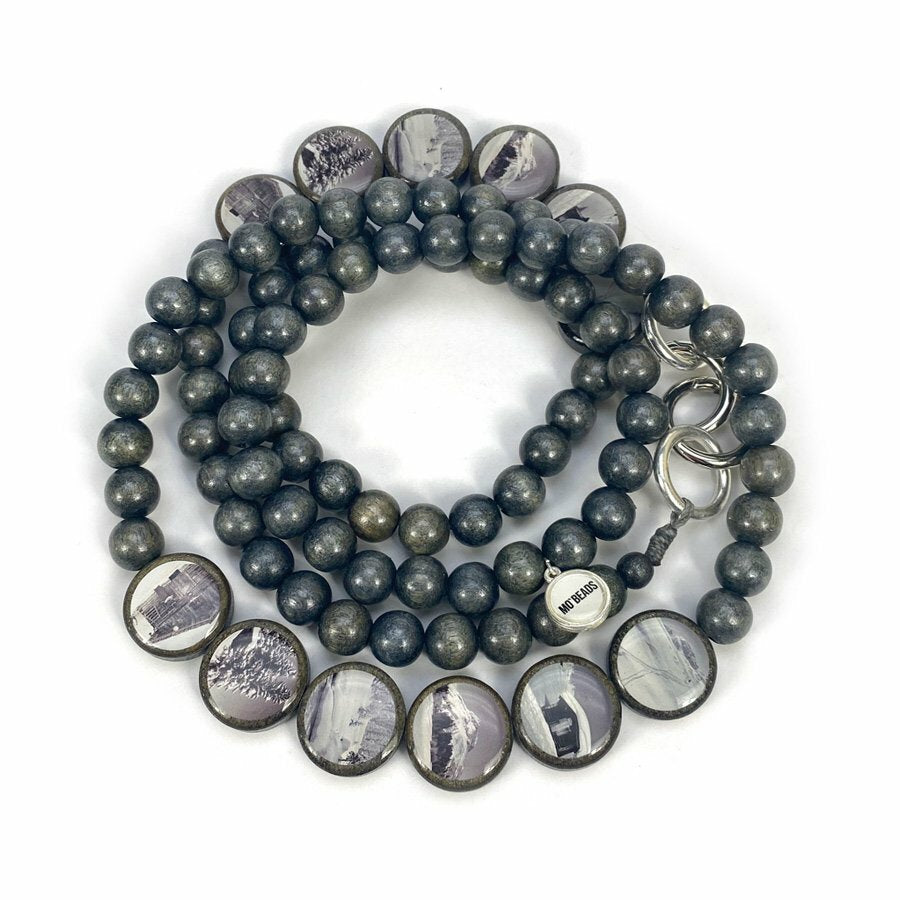 The Mobeads mobile phone chain by Escapulario in grey with beautiful winter landscape pictures is 130 cm long and is hand-knotted in Germany. The wooden beads of the mobile phone chain are strung on a high-quality waxed cotton thread and can be easily swapped with your existing mobile phone chain cover using two pocket rings with a click fastener. The mobile phone chain is very special because it has been extended on both sides with 6 round discs each with great pictures of an alpine winter landscape.