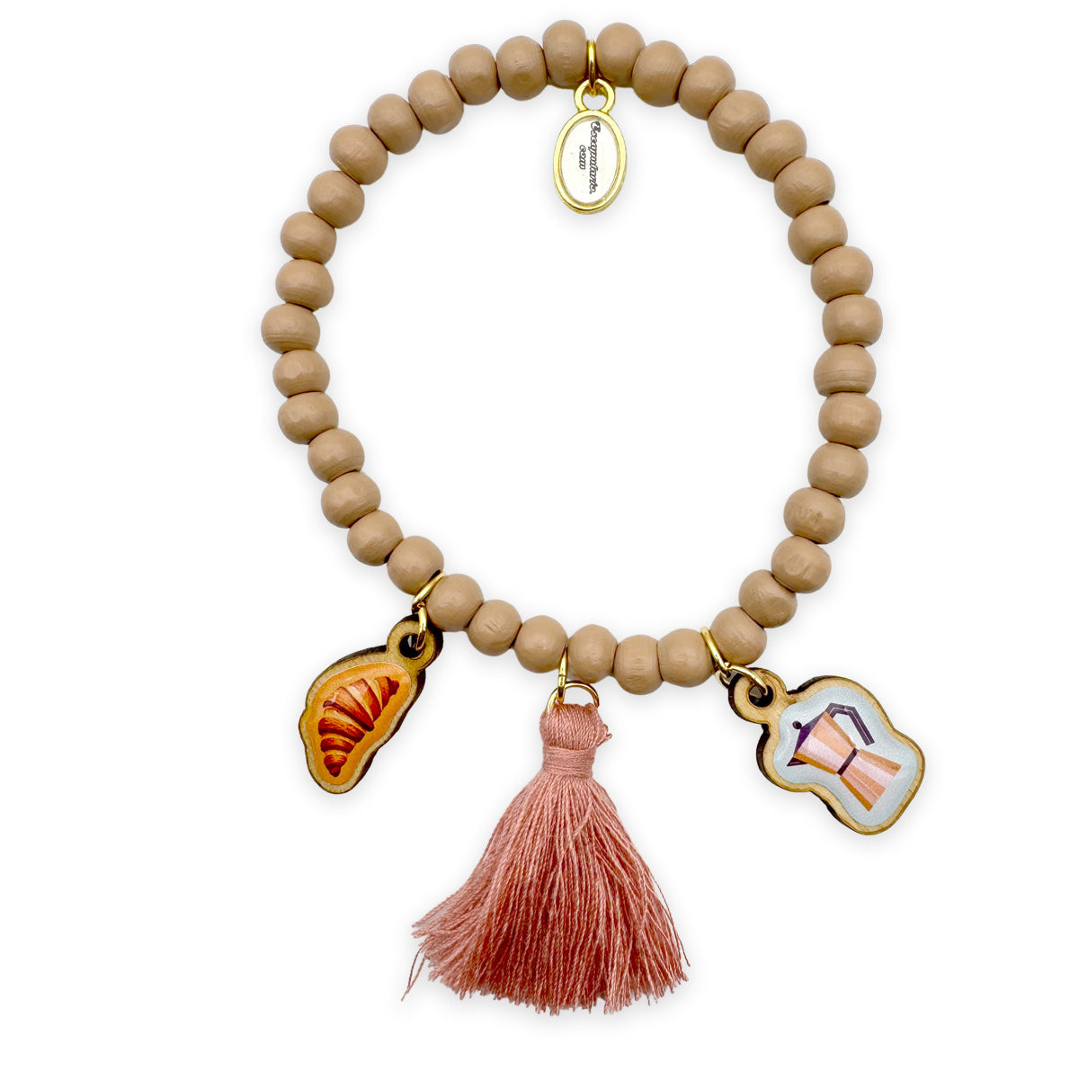 Wooden bracelet in 6mm beads in cappuccino with tassel and 2 wooden pins (croissant & mocha pot)