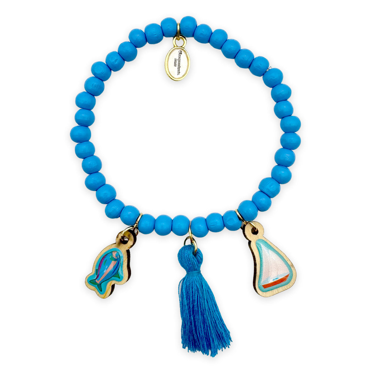 Wooden bracelet in 6mm beads in denim blue with tassel and 2 wooden pins (fish & sailboat)