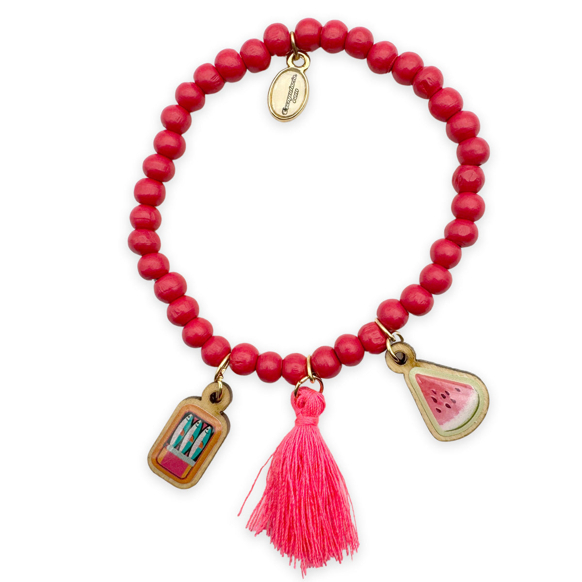 Wooden bracelet in 6mm beads in coral with tassel and 2 wooden pins (sardines & melon)