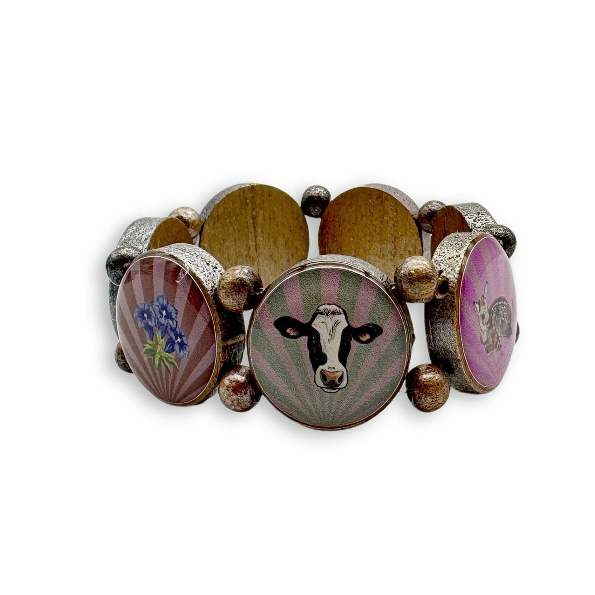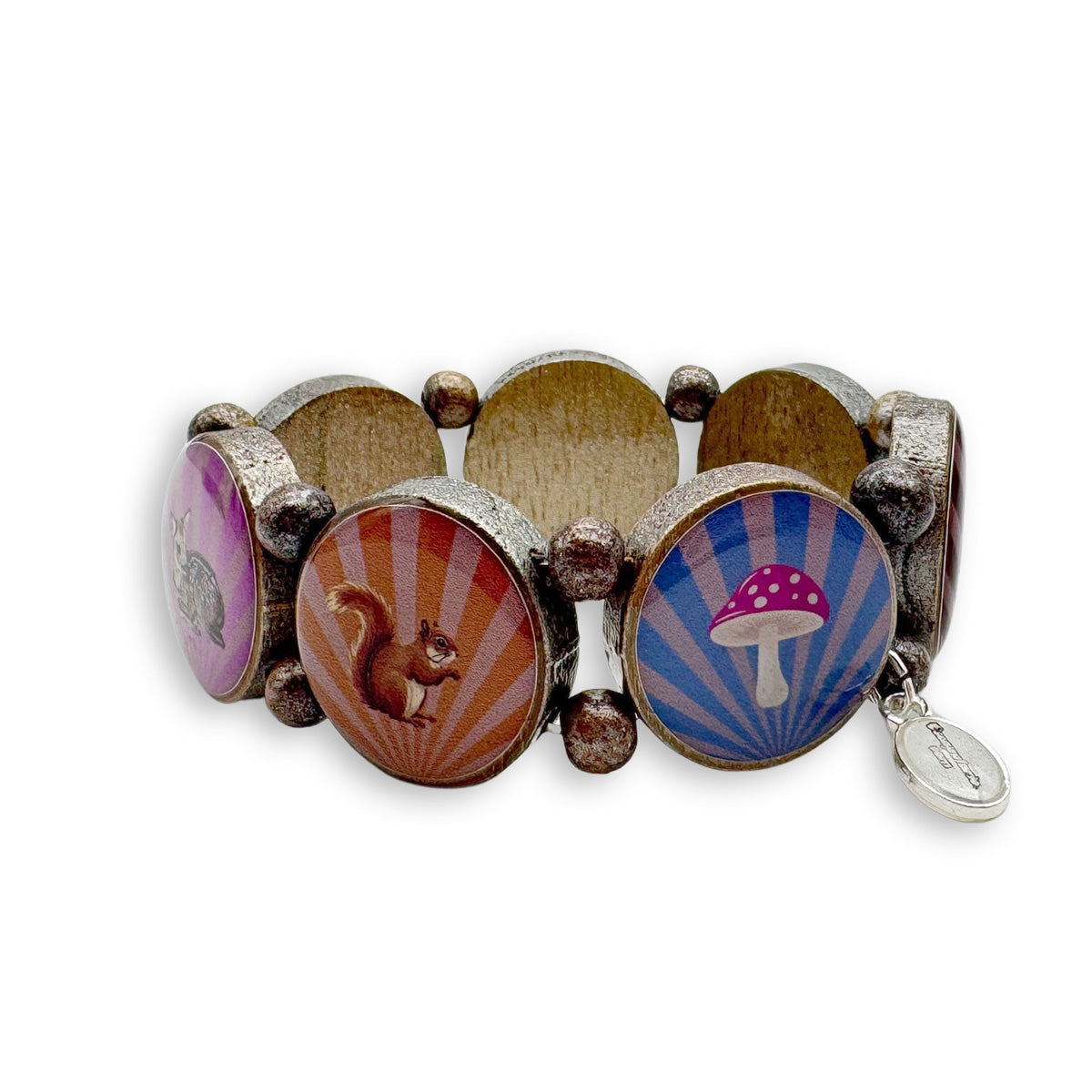 Das hübsche runde Escapulario Holzarmband ist einseitig mit 7 Heimatmotiven wie Kuh, Enzian, Marienkäfer, Pilz, Eichhörnchen, Biene & einem süßen liegendem Bambi bedruckt. Das braune Imbuia Holz wurde mit Silberpigmenten veredelt.