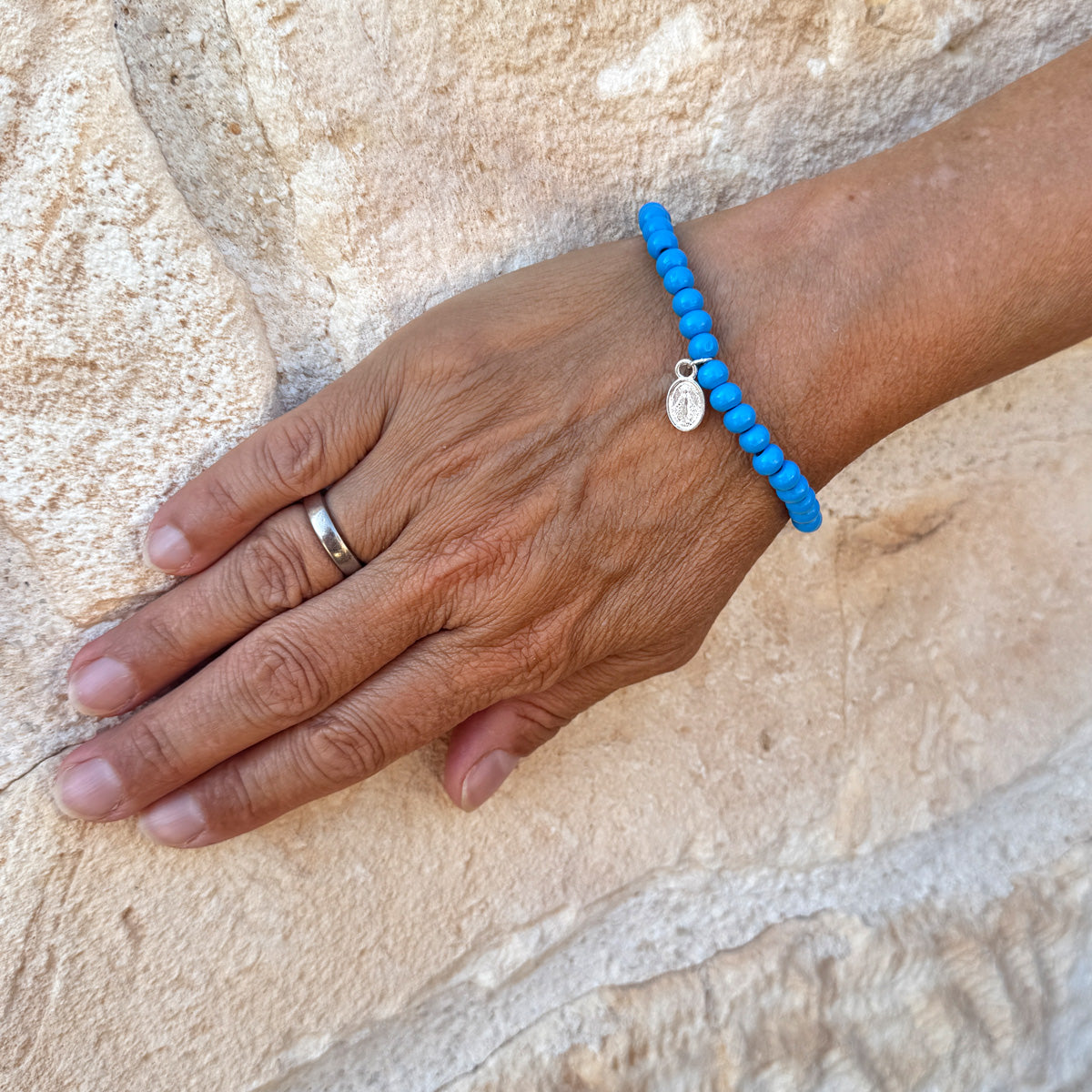 Introducing the trendy denim blue wooden bead bracelet from Escapulario – an accessory that will add a relaxed yet fresh touch to your wrist.