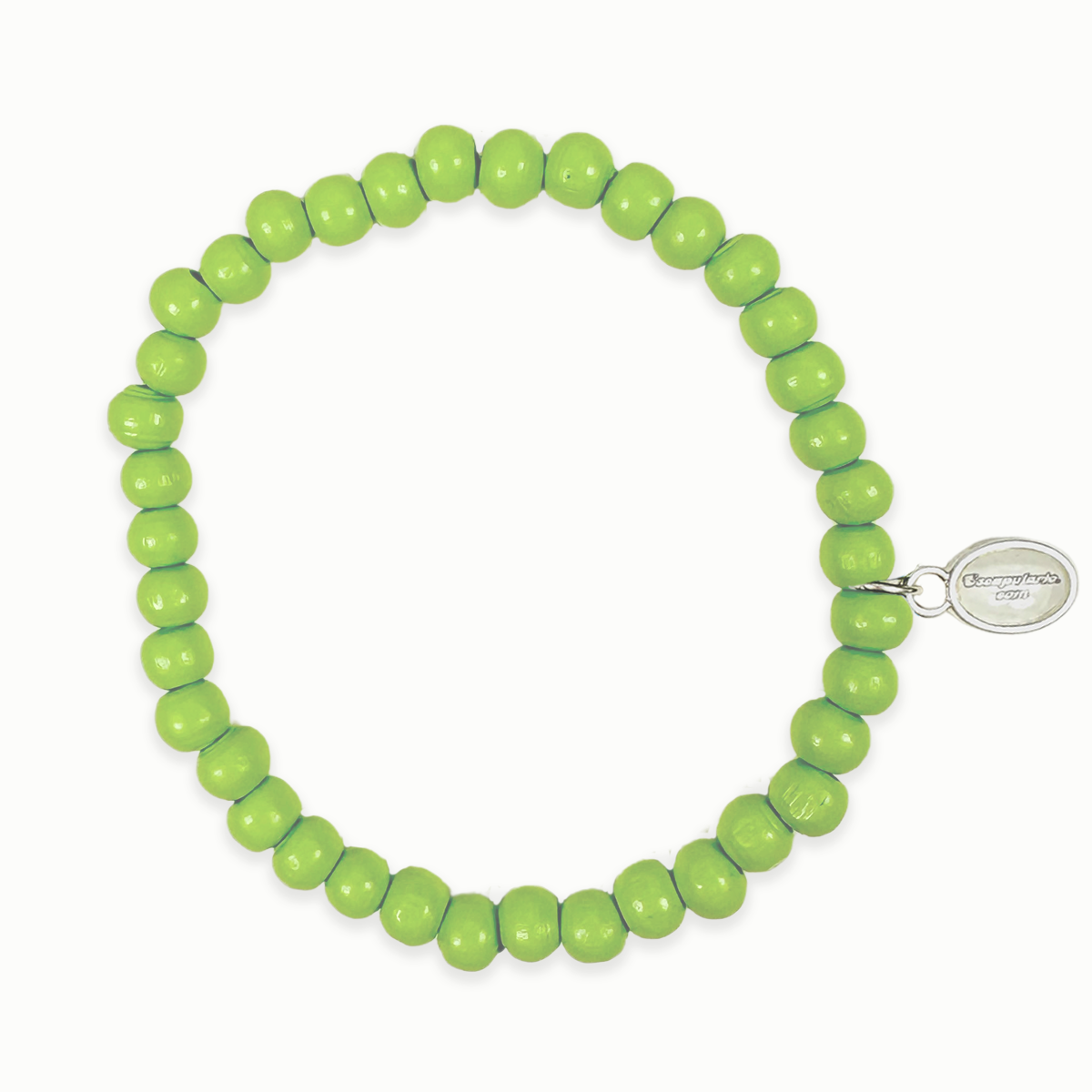 This charming bracelet is made of artfully selected 6mm wooden beads in a refreshing pistachio green, strung on an elastic silicone thread. The color is reminiscent of the invigorating freshness of pistachio ice cream and brings instant vibrancy to your look.