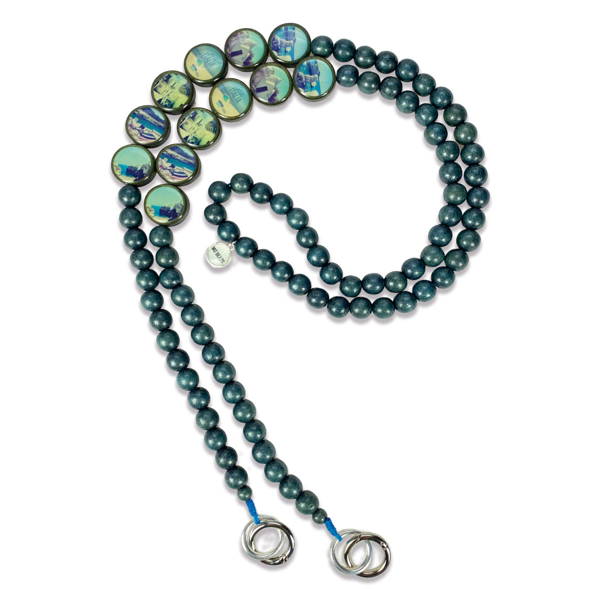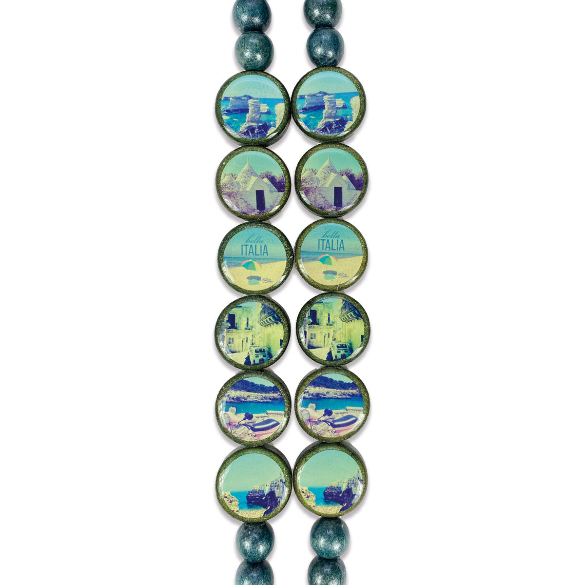 The latest Mobeads mobile phone chain with petrol-colored 12mm wooden beads and 12 printed discs is 130 cm long and is hand-knotted. It is strung on a high-quality waxed cotton thread and can be easily connected to your existing mobile phone chain cover using two pocket rings with a click fastener. The mobile phone chain with 6 adorable pictures of Italy is very special because it has been expanded on each side with 6 differently printed round wooden discs with Italian motifs. A really great fashionable accessory that awakens a longing for a vacation in Italy.