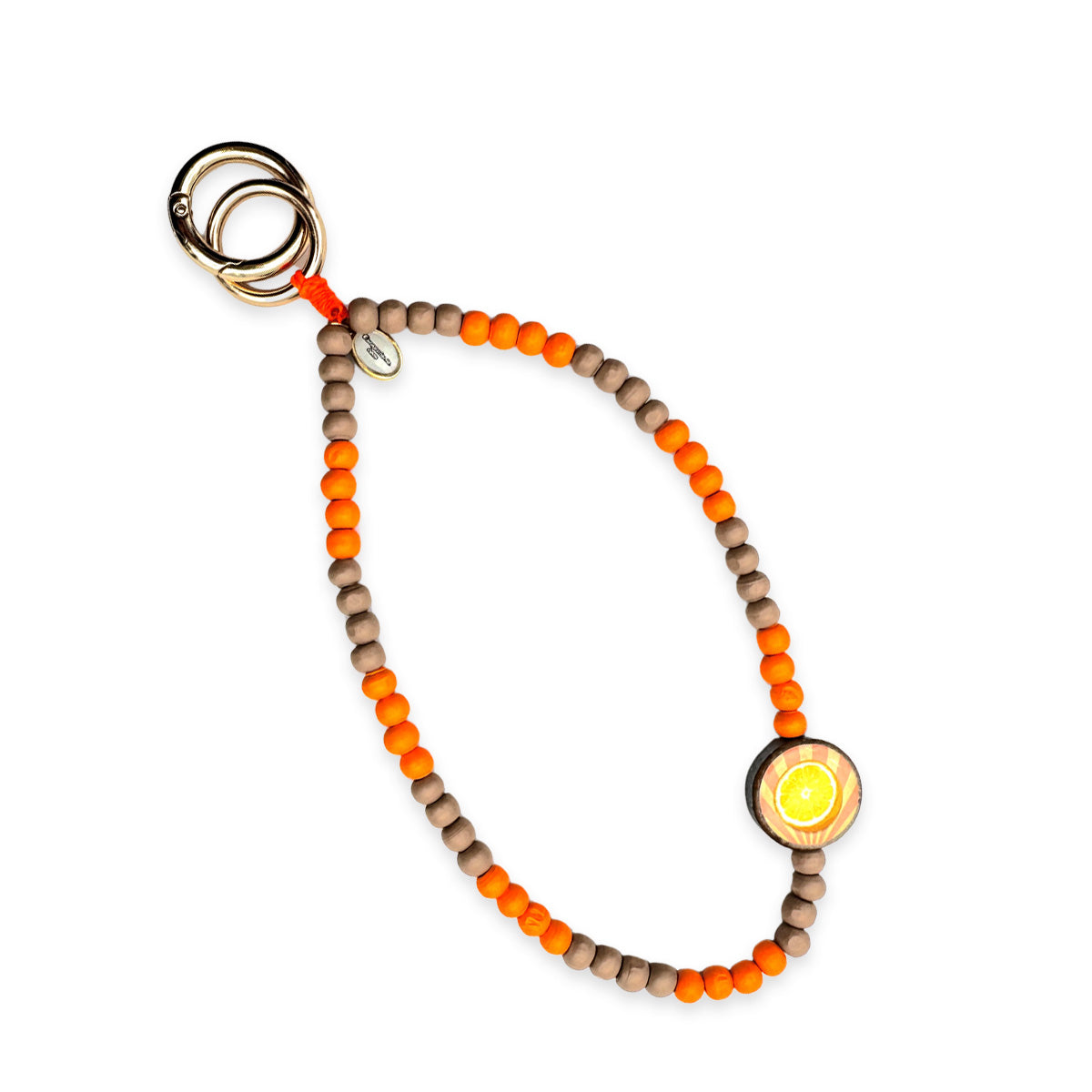 Our latest short cell phone chain with orange-cappuccino colored 6mm wooden beads and printed disc with striped lemon motif is about 20 cm long and is hand-knotted. It is strung on a high-quality waxed cotton thread and can be easily connected to your existing cell phone chain cover or universal plate using a gold pocket ring with a click fastener.