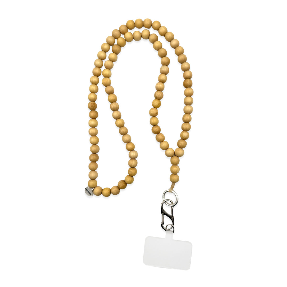 Lanyard with double snap hook and universal plate for attaching a cell phone. 12mm wooden beads in the color brown natural light