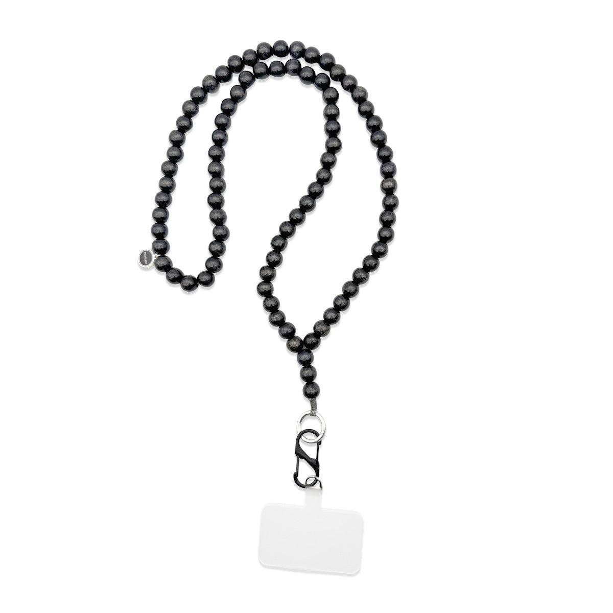 Lanyard with double snap hook and universal plate for attaching a cell phone. 12mm wooden beads in dark grey.