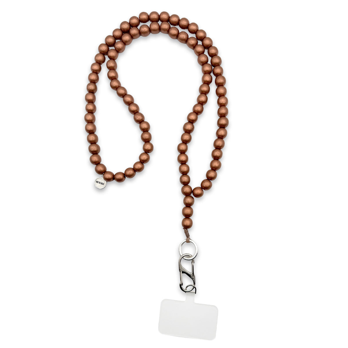 Lanyard with double carabiner and universal plate for attaching a cell phone. 12mm wooden beads in copper color