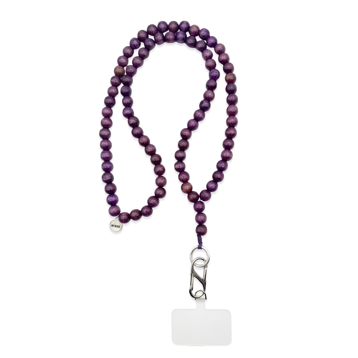 Lanyard with double snap hook and universal plate for attaching a cell phone. 12mm wooden beads in purple