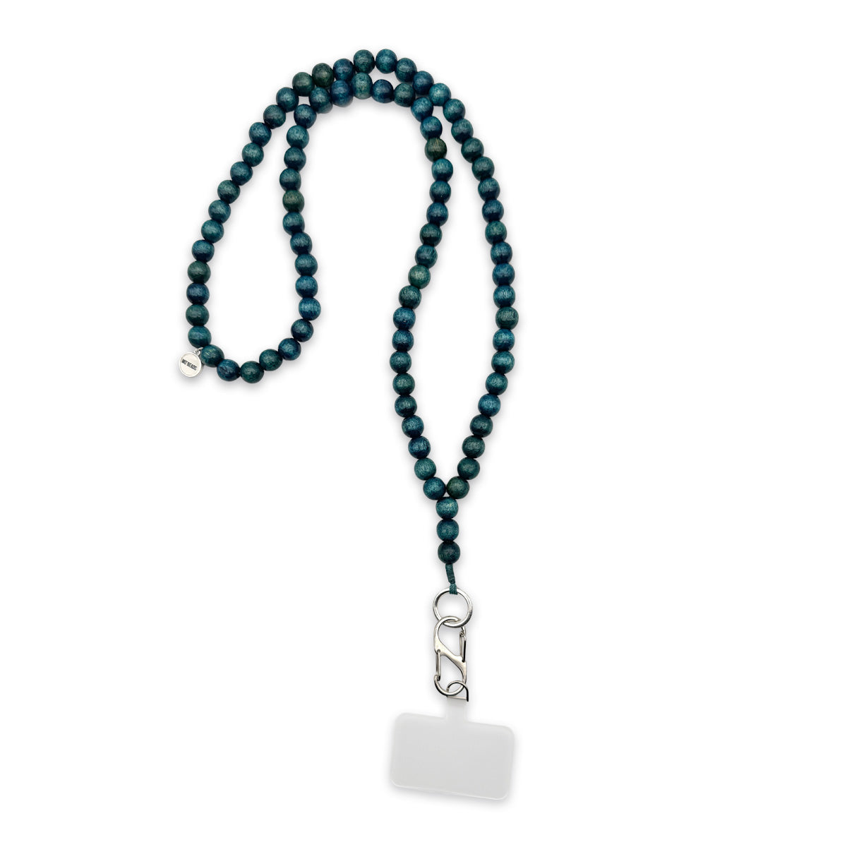 Lanyard with double snap hook and universal plate for attaching a cell phone. 12mm wooden beads in petrol color.