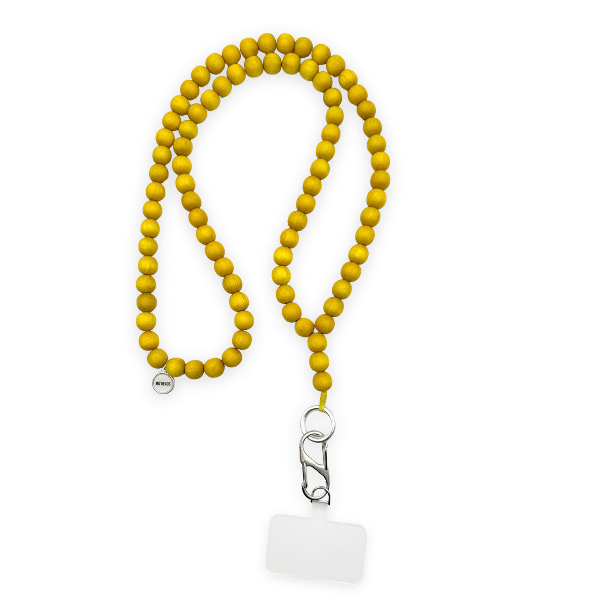 Lanyard with double snap hook and universal plate for attaching a cell phone. 12mm wooden beads in sunny yellow.