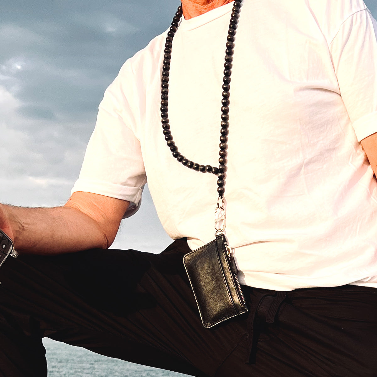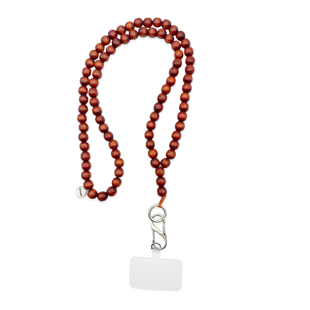 Lanyard with double snap hook and universal plate for attaching a cell phone. 12mm wooden beads in the color terracotta red