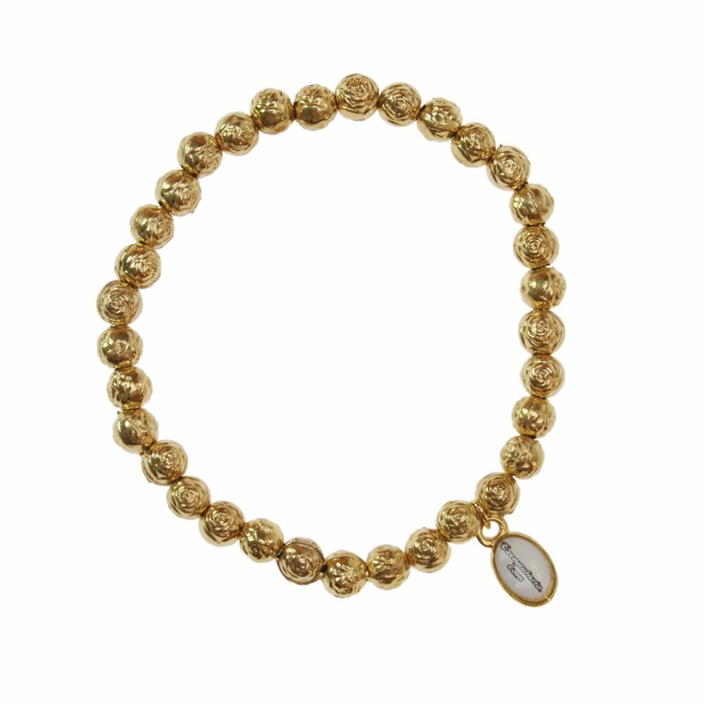 Simple and elegant Escapulario stretch bracelet made of small gold-coloured rose-shaped pearls, with a small label pendant.