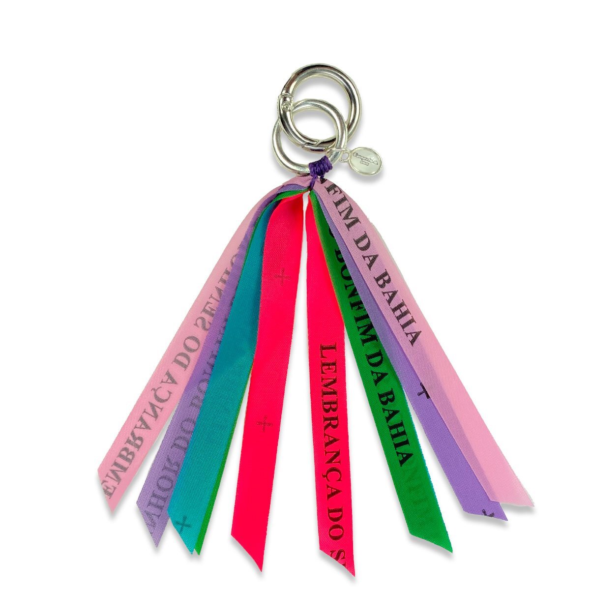 The Escapulario mobile phone and bag charm from MO`BEADS matches the mobile phone chain. The mobile phone charm consists of 5 different colored Bonfim ribbons in the colors pink, lilac, turquoise, green and pink.