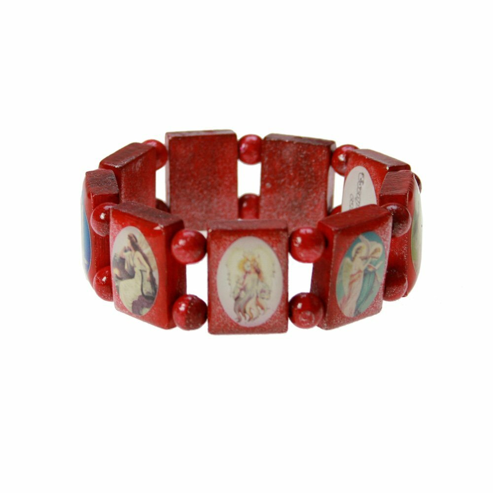 The ultimate elastic classic bracelet - red-colored wood with silver pigments - simple beads and amulets decorated with images of various guardian angels.