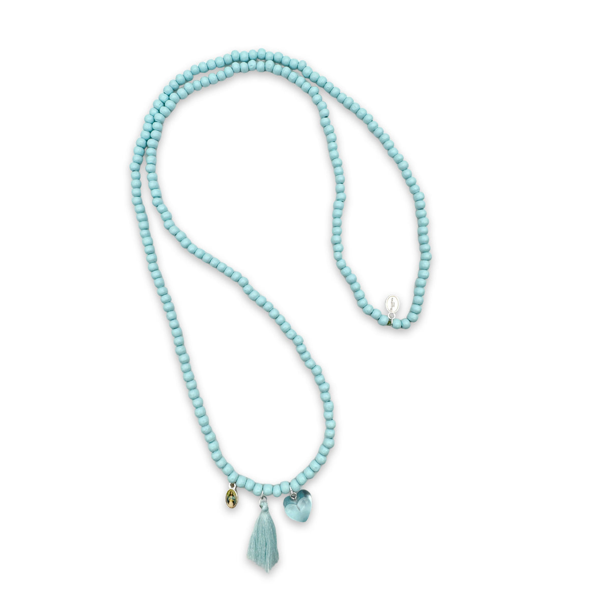 Discover this charming Escapulario style necklace, made from 6mm wooden beads in a heavenly sky blue. A transparent acrylic heart pendant and stylish tassel add an elegant touch to the design. The Madonna pendant completes the necklace and gives it a spiritual touch. The chain length is approximately 52 cm and sits at approximately 36 cm when worn - perfect for adding special meaning and style to any outfit.