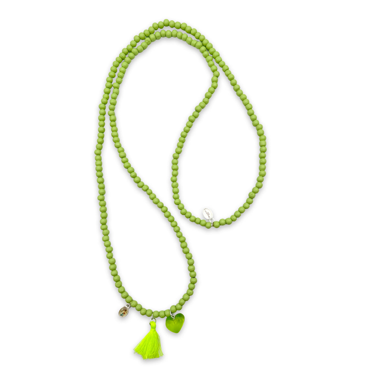 Discover this charming Escapulario-style necklace, made from 6mm wooden beads in pastel pistachio green. A transparent acrylic heart pendant and a stylish tassel add an elegant touch to the design. The Madonna pendant completes the necklace and gives it a spiritual touch. The chain length is approximately 52 cm and sits at approximately 36 cm when worn - perfect for adding special meaning and style to any outfit.