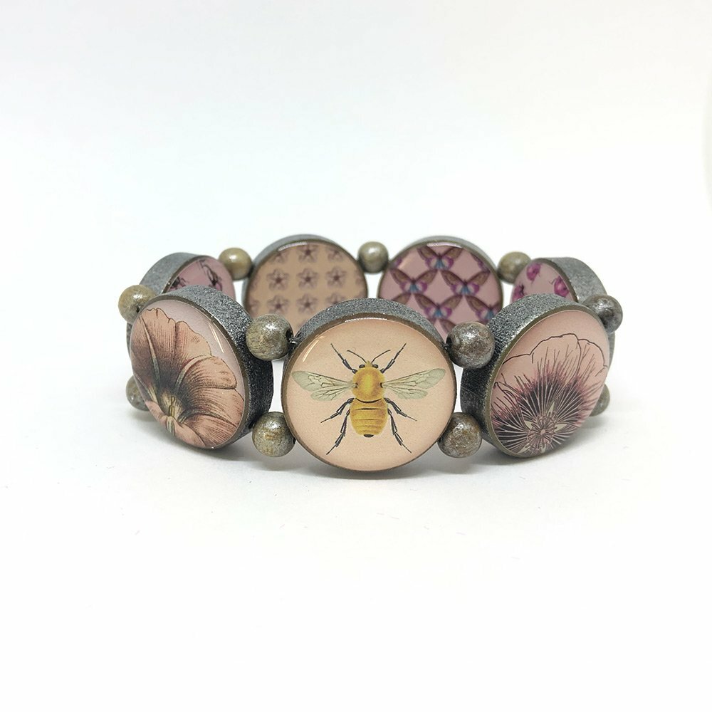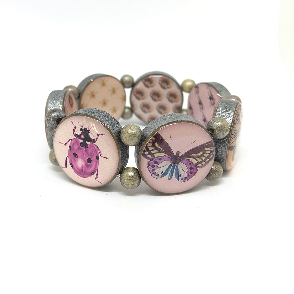 The pretty round Escapulario wooden bracelet is printed on both sides. On one side it is printed with pink bee & co motifs and on the other side with patterns. A very beautiful bracelet for insect lovers