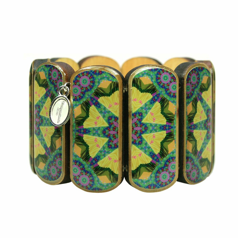 Pretty large wooden bracelet from Escapulario with yellow kaleidoscope motif.