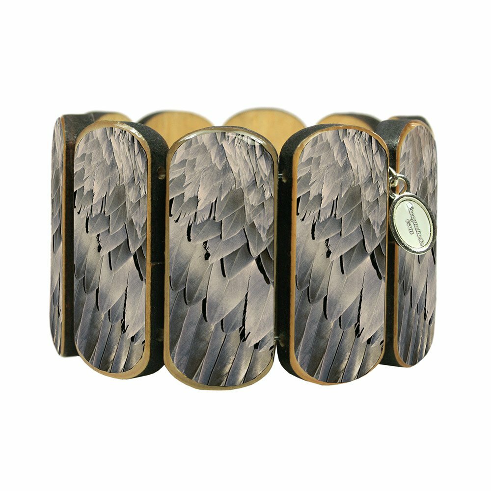 Stylish large wooden bracelet from Escapulario with grey feather motif.