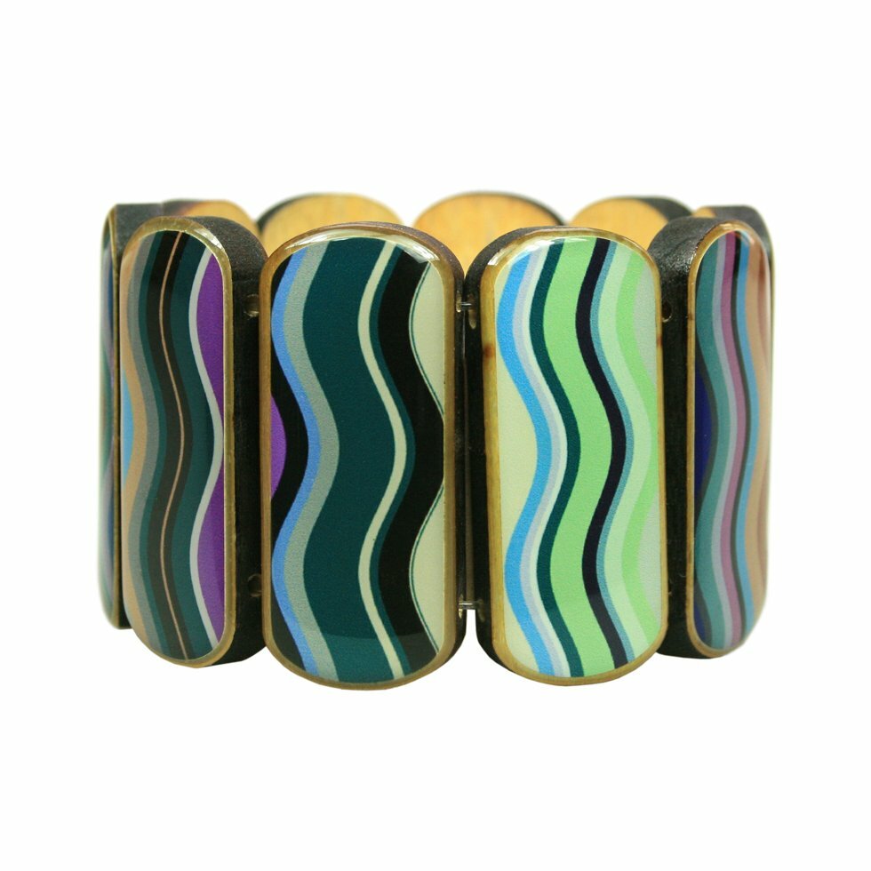 Pretty large wooden bracelet from Escapulario with colorful wave pattern