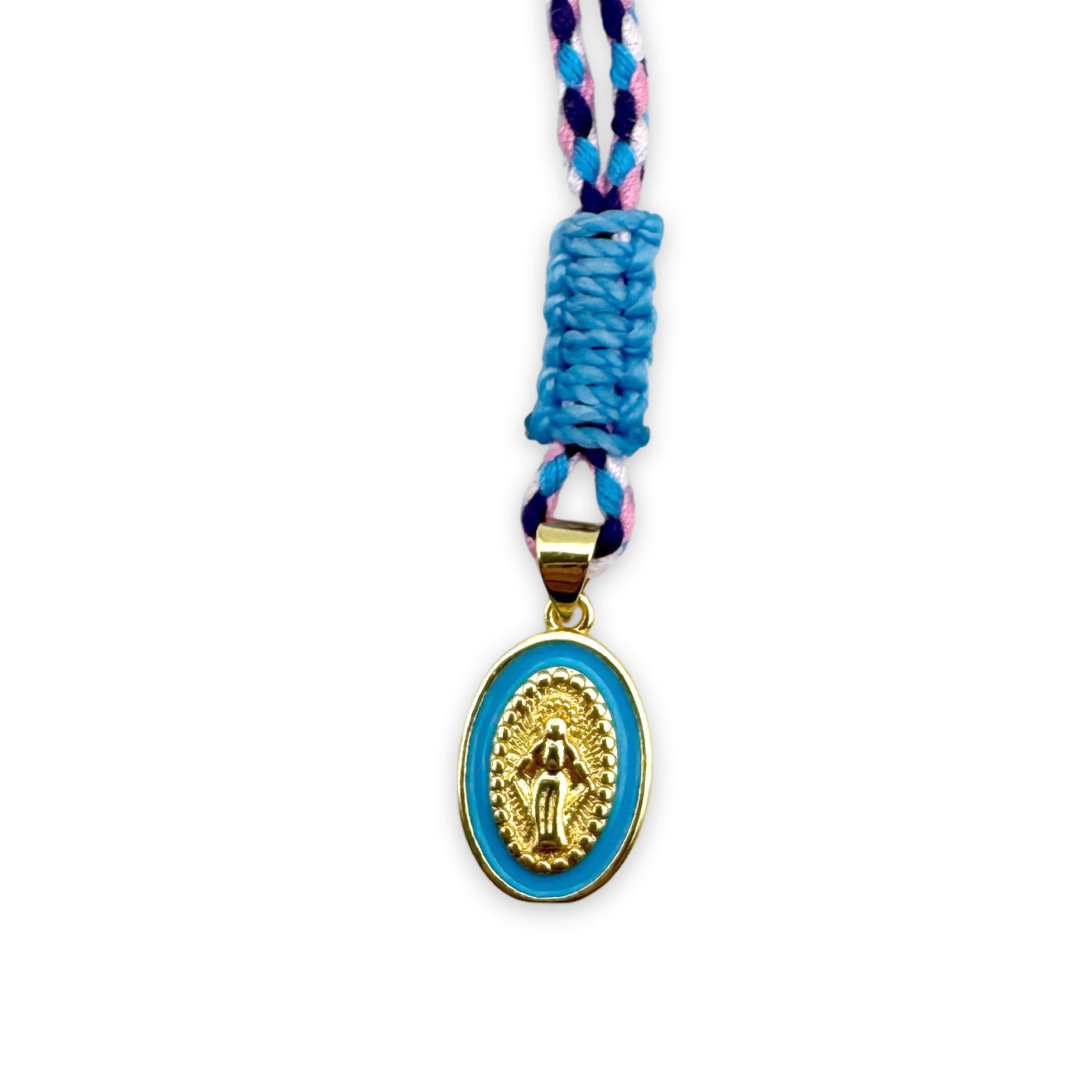 Necklace made of cotton string in shades of blue or light blue with a small Madonna pendant in gold with a blue outline.
