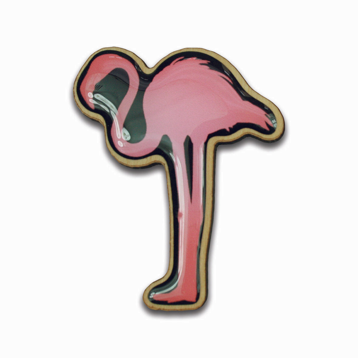 Marfim wood brooch with a pink flamingo motif. The brooch has a pin on the back so that it can be easily attached to any piece of clothing.