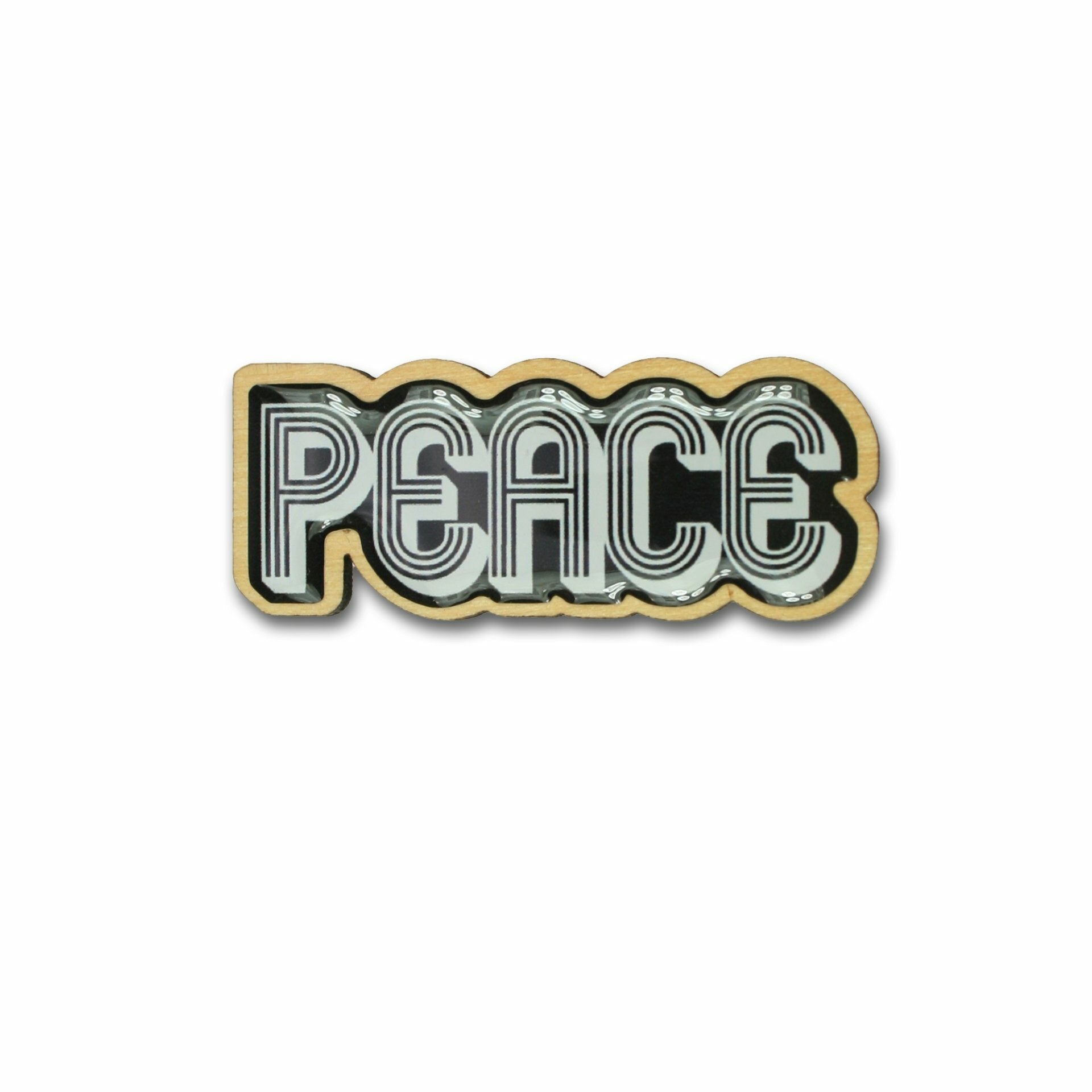 Marfim wood brooch with a peace motif. The brooch has a pin on the back so that it can be easily attached to any piece of clothing.
