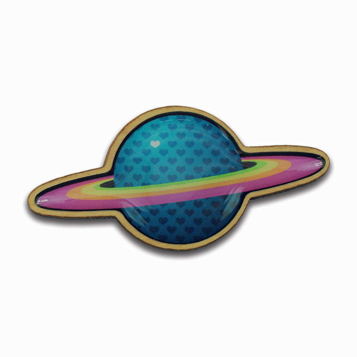 Marfim wood brooch with Saturn motif. The brooch has a pin on the back so that it can be easily attached to any piece of clothing.