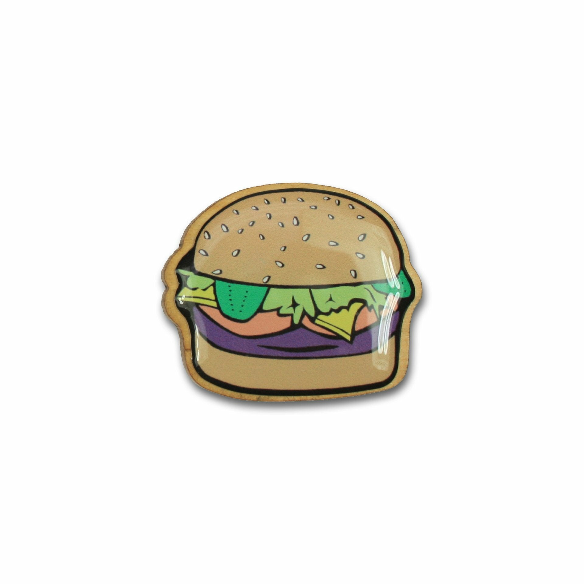 Brooch made of Marfim wood, colorful burger motif. The brooch has a pin on the back so that it can be easily attached to almost any piece of clothing.