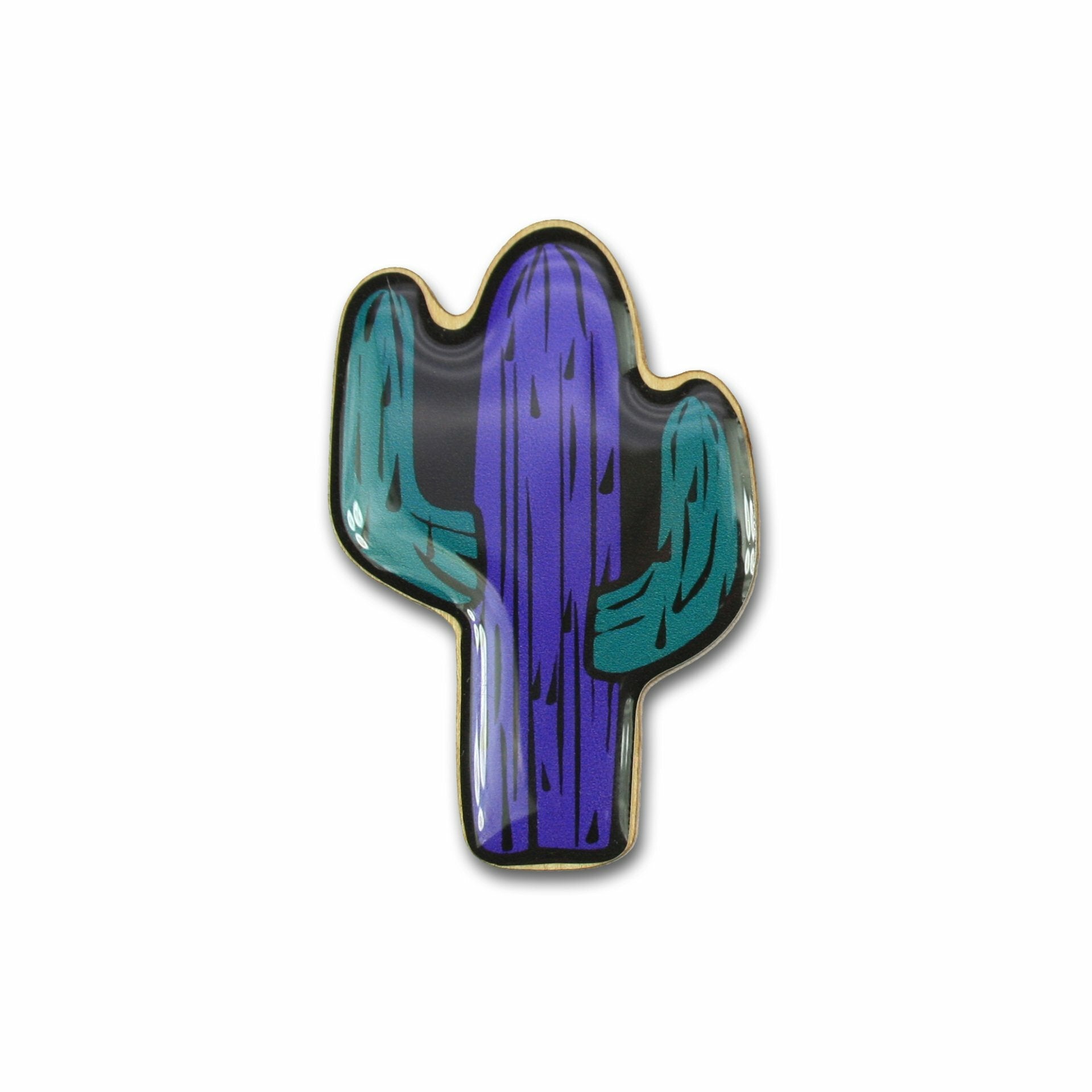 Brooch made of Marfim wood, cactus motif purple/petrol. The brooch has a pin on the back so that it can be easily attached to almost any item of clothing.