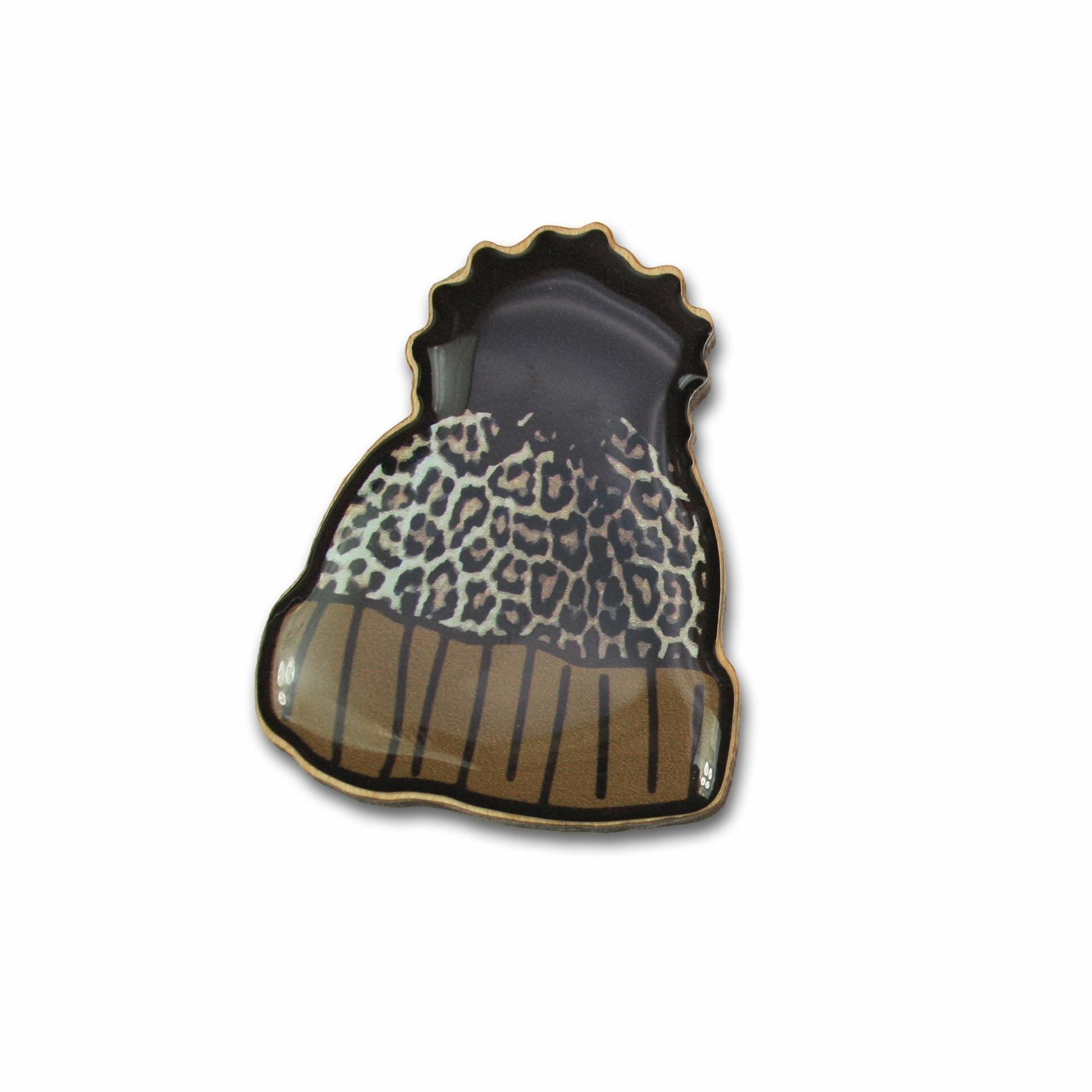 Brooch made of Marfim wood, motif: woolen hat, leopard print, brown. The brooch has a pin on the back so that it can be easily attached to almost any piece of clothing.