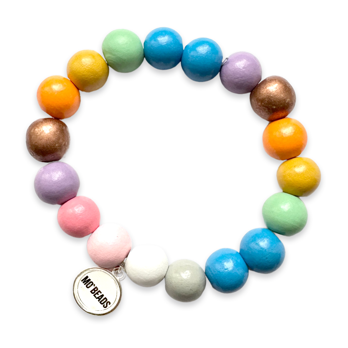 Le bracelet en bois coloré Escapulario de MO`BEADS est assorti à la chaîne de téléphone portable. Le bracelet est composé de 17 perles en bois d'un diamètre de 12 mm.