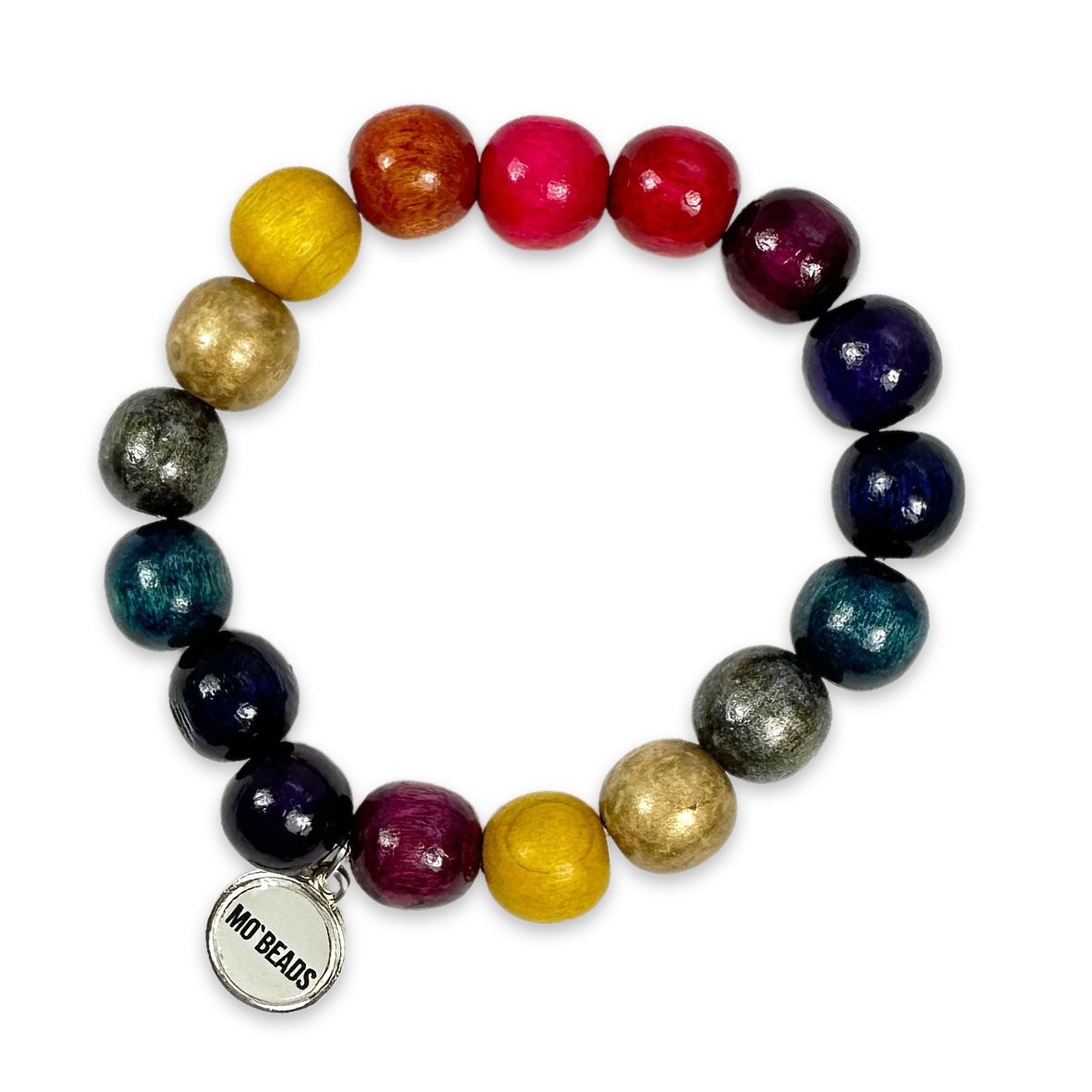 Le bracelet en bois coloré Escapulario de MO`BEADS est assorti à la chaîne de téléphone portable. Le bracelet est composé de 17 perles en bois d'un diamètre de 12 mm.