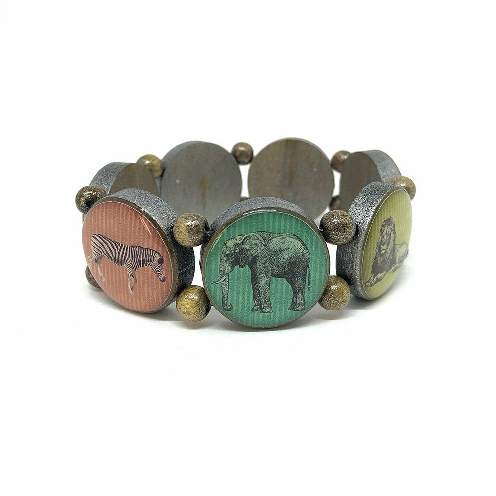 Bracelet en bois marron avec pigments argentés et motifs safari