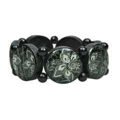 Le joli bracelet rond en bois Escapulario est imprimé sur une face de motifs en dentelle noire. Le bois noir a été traité avec des pigments argentés.