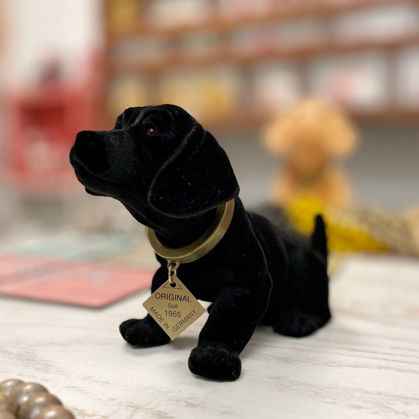 Le teckel penché original, juste un peu plus petit et floqué d'un noir cool. Il mesure environ 19 cm de long et environ 10 cm de haut et est généralement le petit frère du teckel penché produit dans les années 60 que l'on pouvait voir sur presque toutes les plages arrière de VW Beetle.