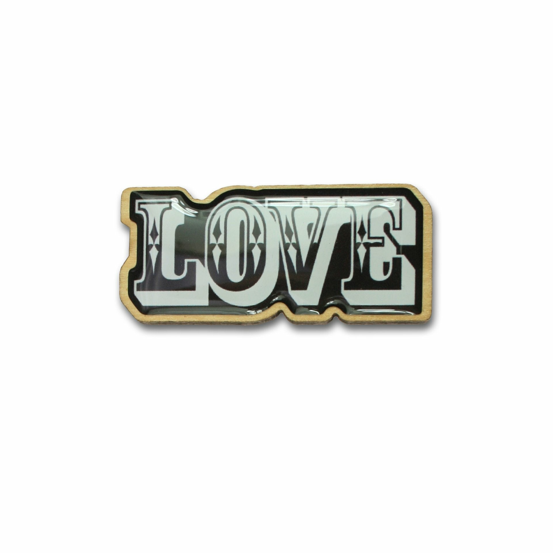 Broche en bois de Marfim, motif Love Noir/Blanc. La broche est dotée d'une épingle à l'arrière afin de pouvoir être facilement attachée à presque n'importe quel vêtement.