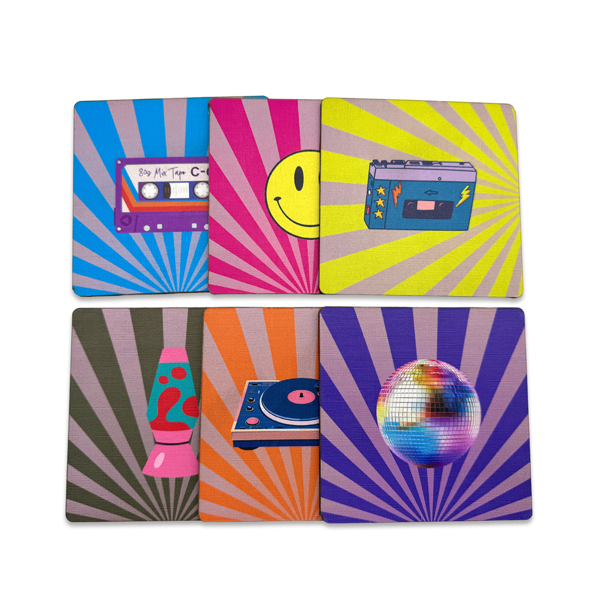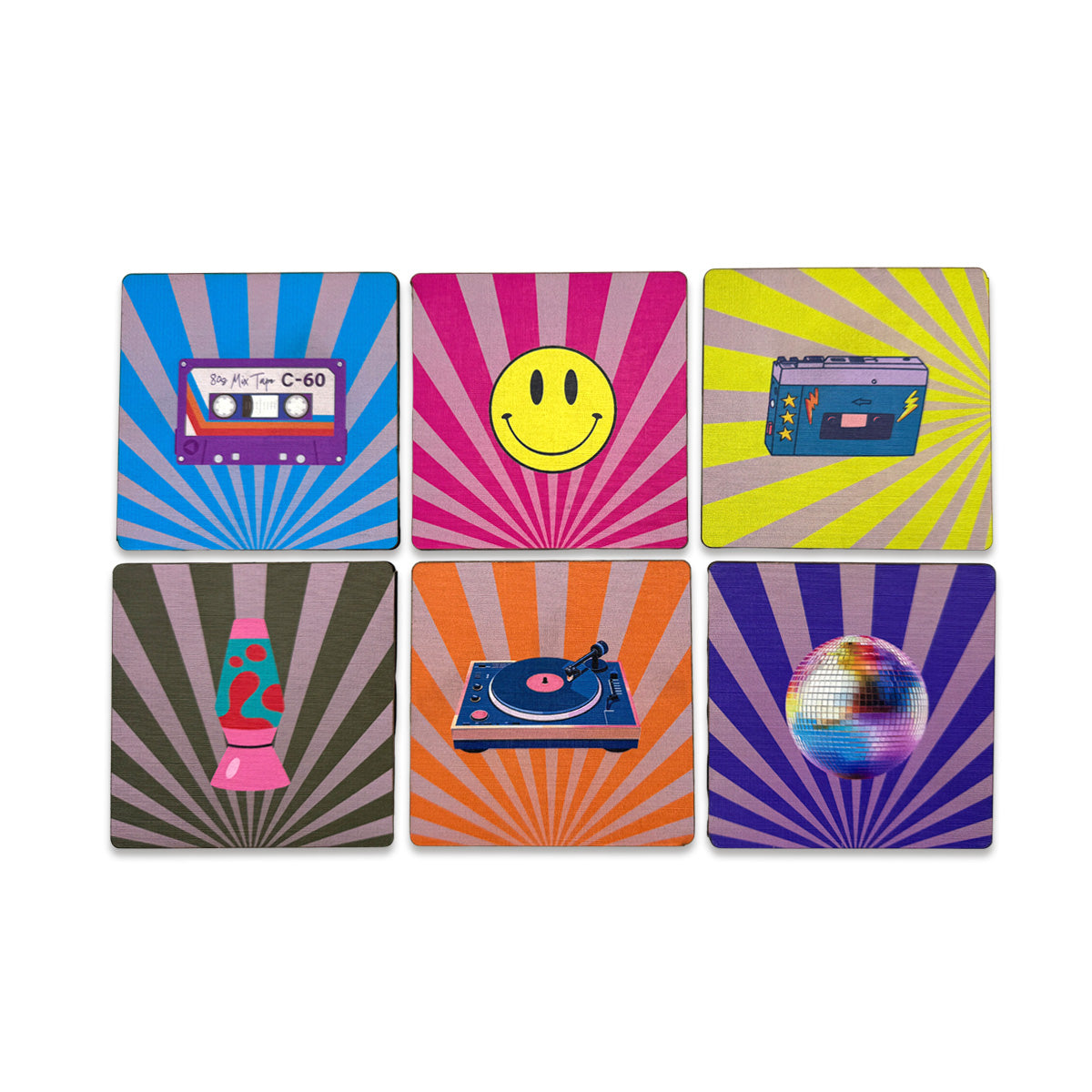 6er MDF Untersetzer Set mit verschiedenen Motiven: Lavalampe, Spiegelkugel, Plattenspieler, Kassette, Walkman und einem Smile auf Streifenhintergrund. Größe 10cm x 10cm