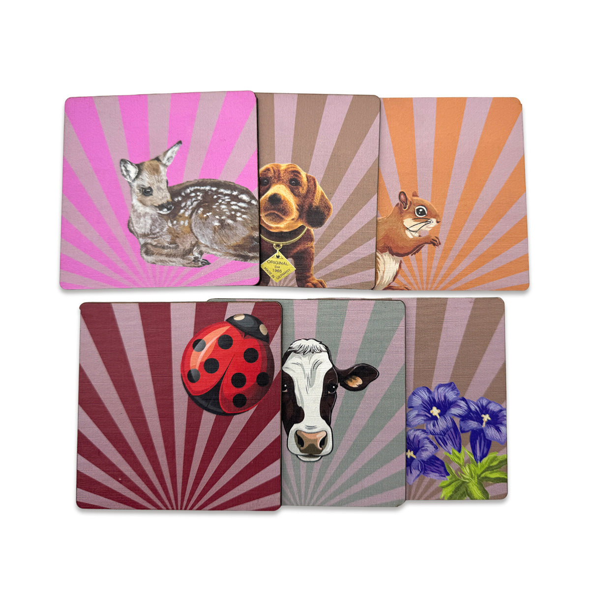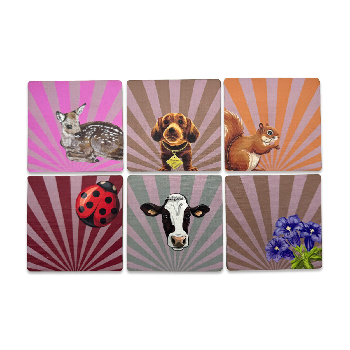 6er MDF Untersetzer Set mit verschiedenen Motiven: Marienkäfer, Bambi, Wackeldackel, Kuh, Enzian & Eichhörnchen auf Streifenhintergrund. Größe 10cm x 10cm